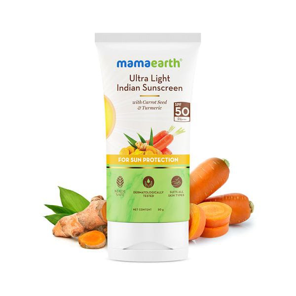 Be fearless when you go out in the sun with Mamaearth Ultra Light Indian Sunscreen. Power-packed with carrot seed oil, turmeric oil, and orange peel oil – this SPF 50 comes with PA +++ to help safeguard your skin even in harshest Indian summers.